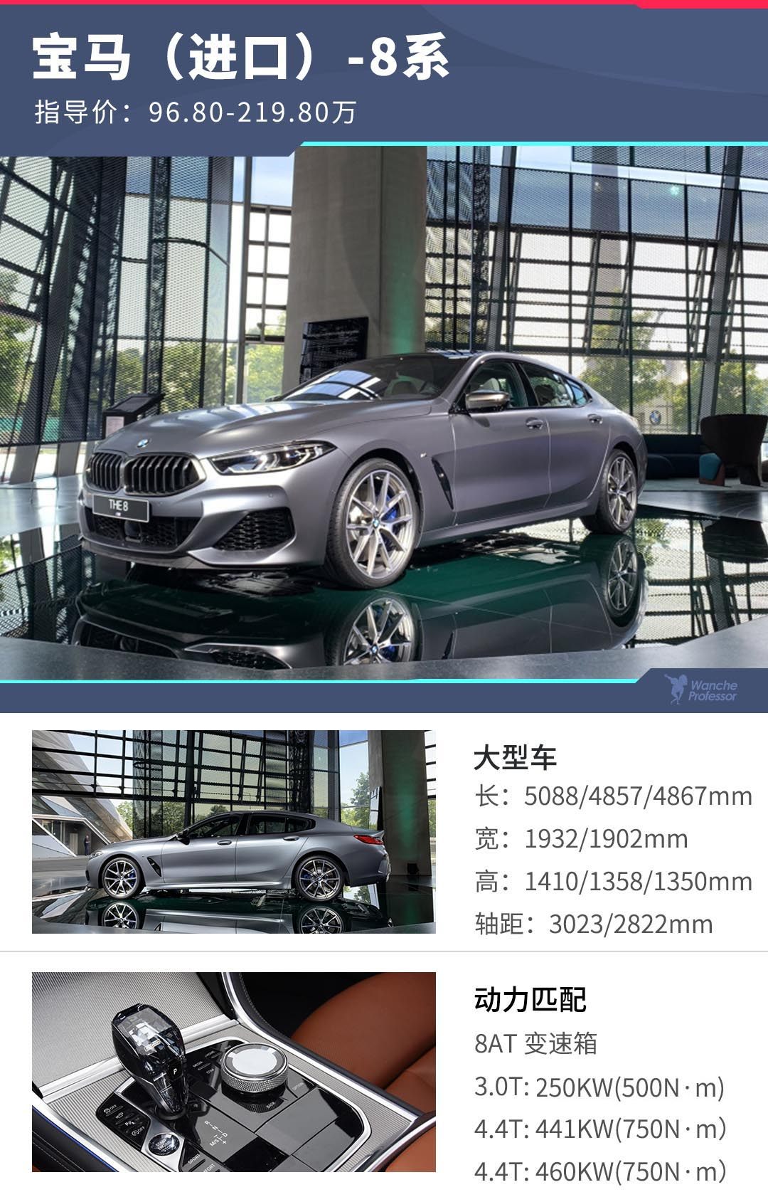 教授点评:都已经是百万级别的轿车了,市面上该有的配置也都会配备,标配会非常丰富,所以在配置无差的情况下怎么选车呢?有钱任性M8,四驱系统+V8;钱少就去买四门,兼顾家用还能跑;想要个性不用挑,双门、敞篷任你挑!