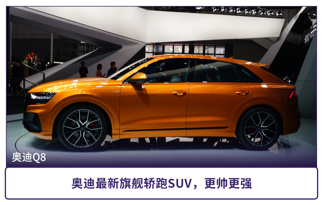 这是奥迪品牌的旗舰轿跑SUV,定位中大型SUV,车身尺寸达到4986*1995*1705mm,轴距为2987mm,。它采用了最新家族式设计,极具进攻性,而溜背式车顶更是亮点之一。动力也是一绝,采用3.0T发动机并且带有48V轻混系统,匹配8AT变速箱,全系标配Quattro四驱系统。还有它有RS Q8这一衍生车型,与兰博基尼Urus共享4.0T双涡轮增压V8发动机。Q8的出现,再次拉高奥迪品牌上限,营造运动、年轻、豪华的品牌调性。