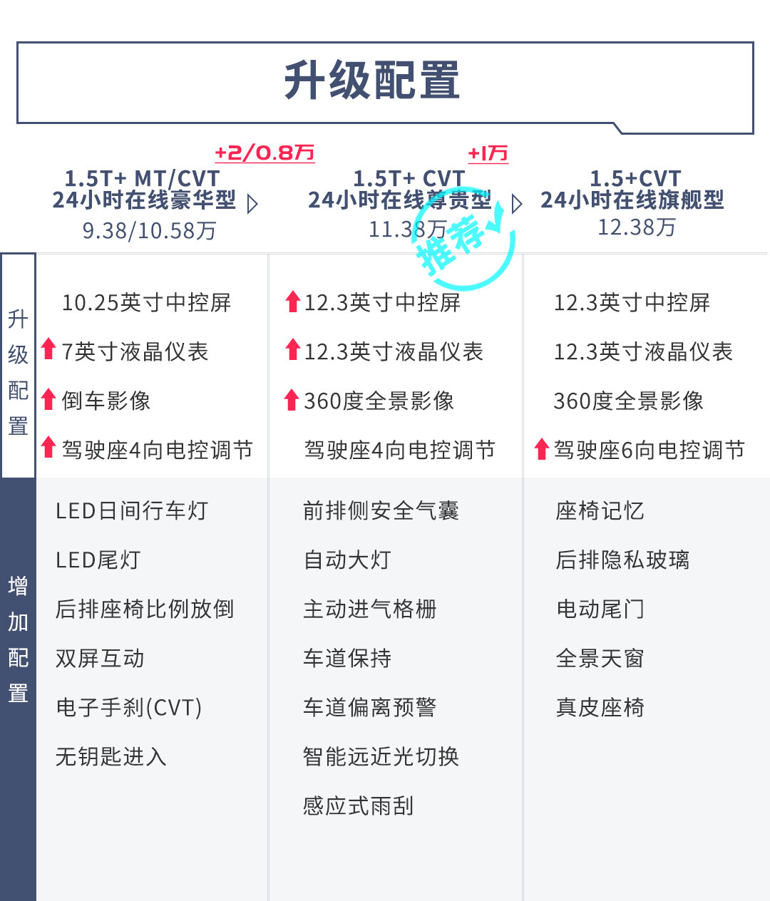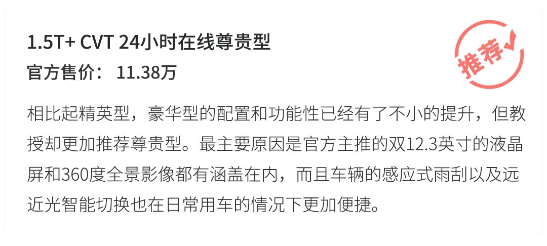 在6款车型中,精英型和豪华型有区分不同变速箱的车型,但相同版本的配置全面性有做到水准一致,不过高配车型依旧采用卤素光源是个人认为配置上比较遗憾的点。考虑到日常实用性较高功能性较强的配置涵盖,1.5T+ CVT 24小时在线尊贵型会比较值得推荐。