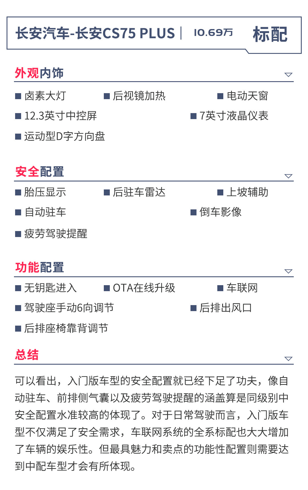 CS75 PLUS的入门版本为手动豪华型,但其对比起次低配的自动精英型配置水准会稍高一点,因此教授觉得官方是取消了原计划当做入门版本的手动精英型。但比较可惜的是手动豪华型的配置水准没能向自动豪华型看齐,两款车型间除了变速箱差距外,配置差距也有一定距离。