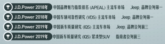 生活方式的改变之上,更有生活品质的缔造。放眼广受媒体与市场关注的美国老牌质量检测机构J.D. Power所发布的权威报告,Jeep品牌不仅在2018年 J.D. Power“中国汽车魅力指数研究报告(APEAL)”中,以721分位居主流车市场第一,也荣膺J.D. Power “2018中国车辆可靠性研究(VDS)”主流车市场第一;2019年,Jeep品牌进入了J.D. Power“中国新车质量报告(IQS)”榜单前三,这些骄人成绩证明了Jeep在SUV领域的专业进阶从未停止,更助力品牌在9月5日开幕的2019成都国际车展上带来强大的家族阵容,从而向成都消费者真正诠释,不是所有SUV都叫Jeep。