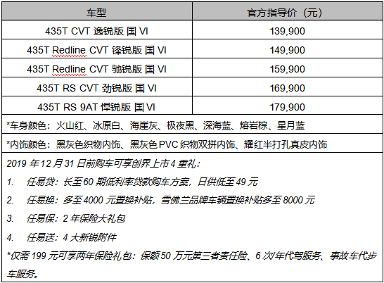 (2019年9月5日)今日,上汽通用汽车雪佛兰品牌宣布,精悍新锐SUV创界Trailblazer正式上市,共推出包括Redline尚·红系列及RS系列在内的5款车型,售价13.99万元至17.99万元。作为通用汽车新一代全球车型,创界以Smart Propulsion智驱科技打造高效动力系统,搭载第八代Ecotec 435T智能直喷涡轮发动机,全系满足“国六B”排放标准;配备全面升级的“第二引擎” 全新一代MyLink+智能车载互联系统以及先进的智能科技安全配置,具有同级领先的产品实力。在上汽通用汽车“双擎出击”服务政策下,创界全系车型均可享受发动机、变速箱等动力总成主要零部件8年或16万公里原厂质保服务,以及可享受每年100G“OnStar安吉星车联应用免费流量”。