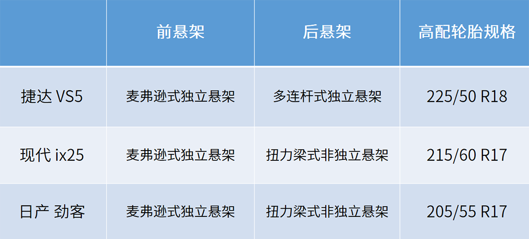 捷达VS5采用同价位难得的前麦弗逊后多连杆式全独立悬架,以及更高规格的轮胎,在过弯时可以带来更好的支撑以及抓地力,驶过坑洼也更从容舒适,再配合专业的SUV底盘调校技术,软硬兼施之下,当然要比起多半采用前麦弗逊后扭力梁式半独立悬架的对手更佳,无论是性能方面,亦或是舒适性方面。