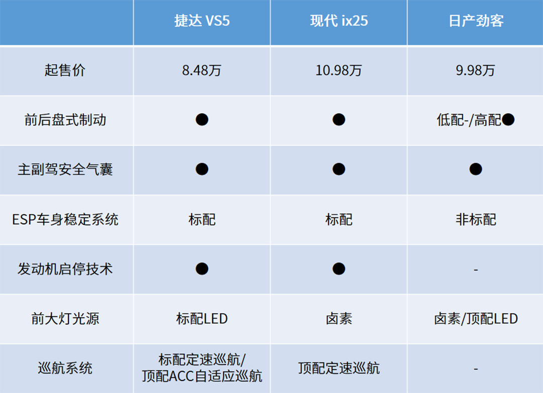 对于来自韩国的现代ix25以及日本的日产劲客,相信大家都相当了解了,教授就不多说了。捷达这一品牌,虽然成立时间不长但来头不小,它是大众品牌的子品牌,是为了满足年轻用户购车需求的纯正德系品牌。继承了捷达这一深入人心的国人IP,以及来自大众旗下的身份,它自然有着大众又或者说德系品牌一贯以来的高品质。