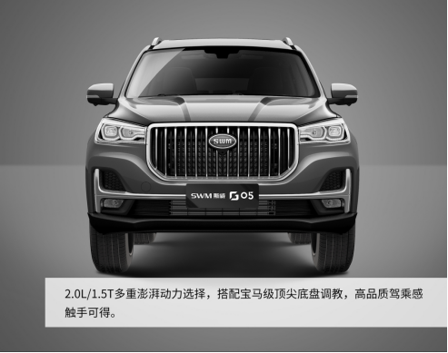 上档次、上品质、上安全!配备双色品质内饰、高档次皮质座椅和新潮几何发光面板,SWM斯威G05轻奢质感随处可见。全系电子手刹、一键启动+无钥匙进入,体验豪华科技感。ADAS行车辅助、ESP车身电子稳定,“内、外、远、近”全方位安全护航。2.0L/1.5T多重动力选择,搭配宝马级顶尖底盘调教,高品质驾乘触手可得。凝聚每一份安心舒适的小确幸和满溢而出的澎湃激情,现代休旅亦将更加丰富多彩。