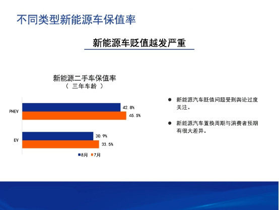 日前,中国汽车流通协会公布了《2019年8月中国汽车保值率报告》。虽然相较7月PHEV类别三年保值率环比上升至45.5%,EV类别环比上升至33.5%,但是三年时间价值最低蒸发约55%,最高蒸发约67%,后期保值率迟迟未有起色,是阻碍新能源汽车扩大市场规模与体量的绊脚石。