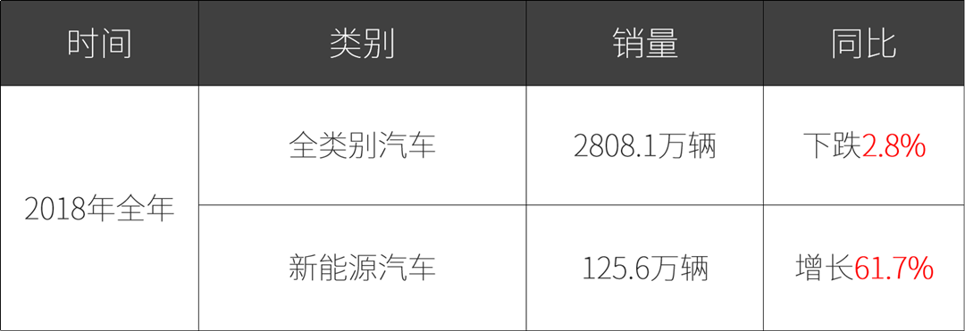根据数据显示,2018年全类别汽车的销量为2808.1万辆,同比下跌2.8%。而新能源汽车的销量为125.6万辆,同比上升61.7%。
