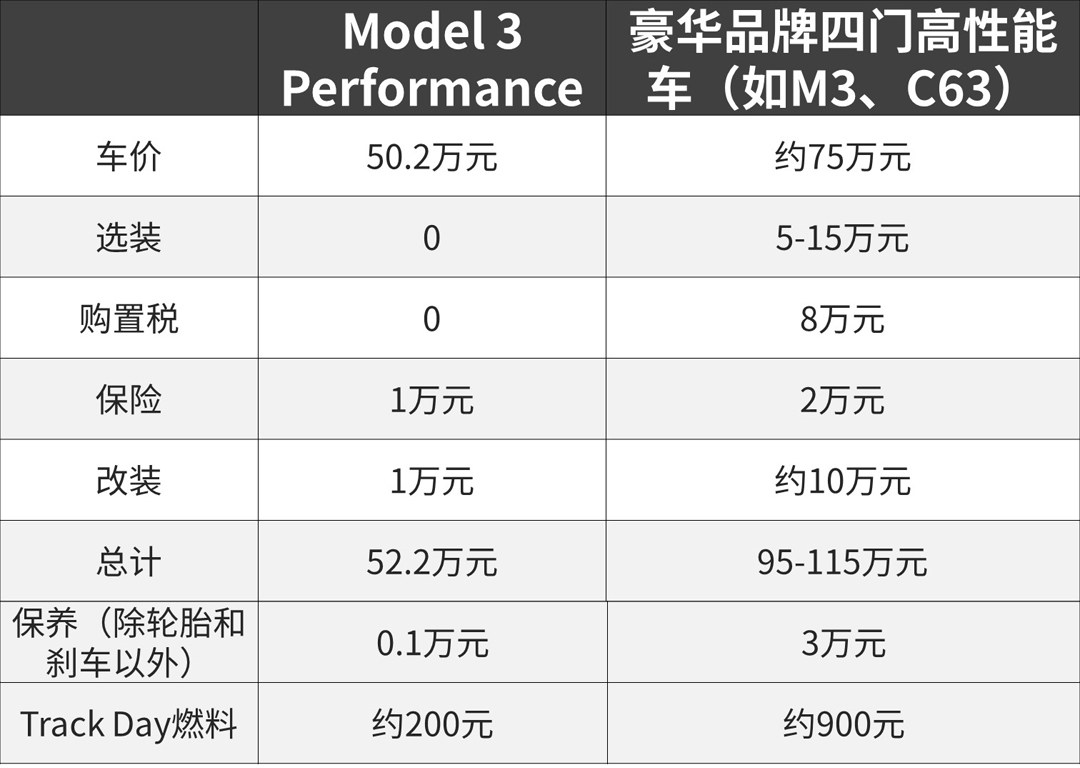 据官方介绍,Model 3高性能版车型对标的传统豪华品牌四门高性能车,Model 3在价格、选装、保险、改装以及能耗等方面都有一定的优势,购车后的保养费用更是低廉得不可想象;如果使用Model 3作为赛道日用车,抛开必要的轮胎刹车磨损以外,其余的消耗几乎为0,这也是为什么特斯拉敢将Model 3拿出来跟M3、C63对比的原因之一。