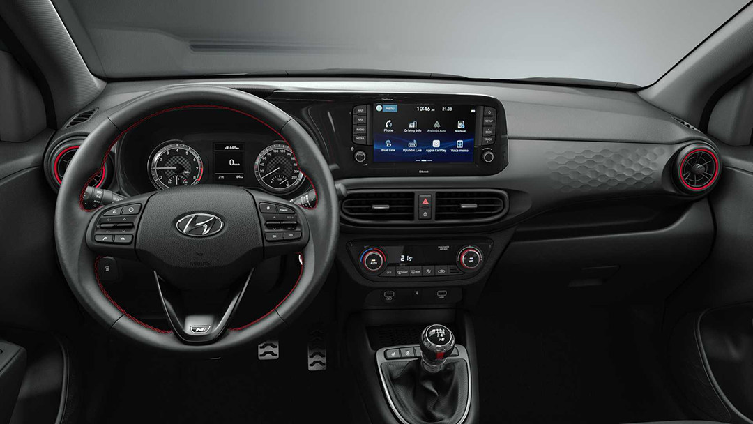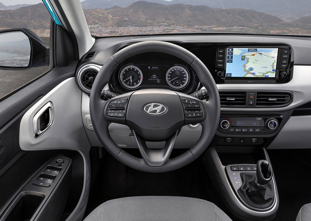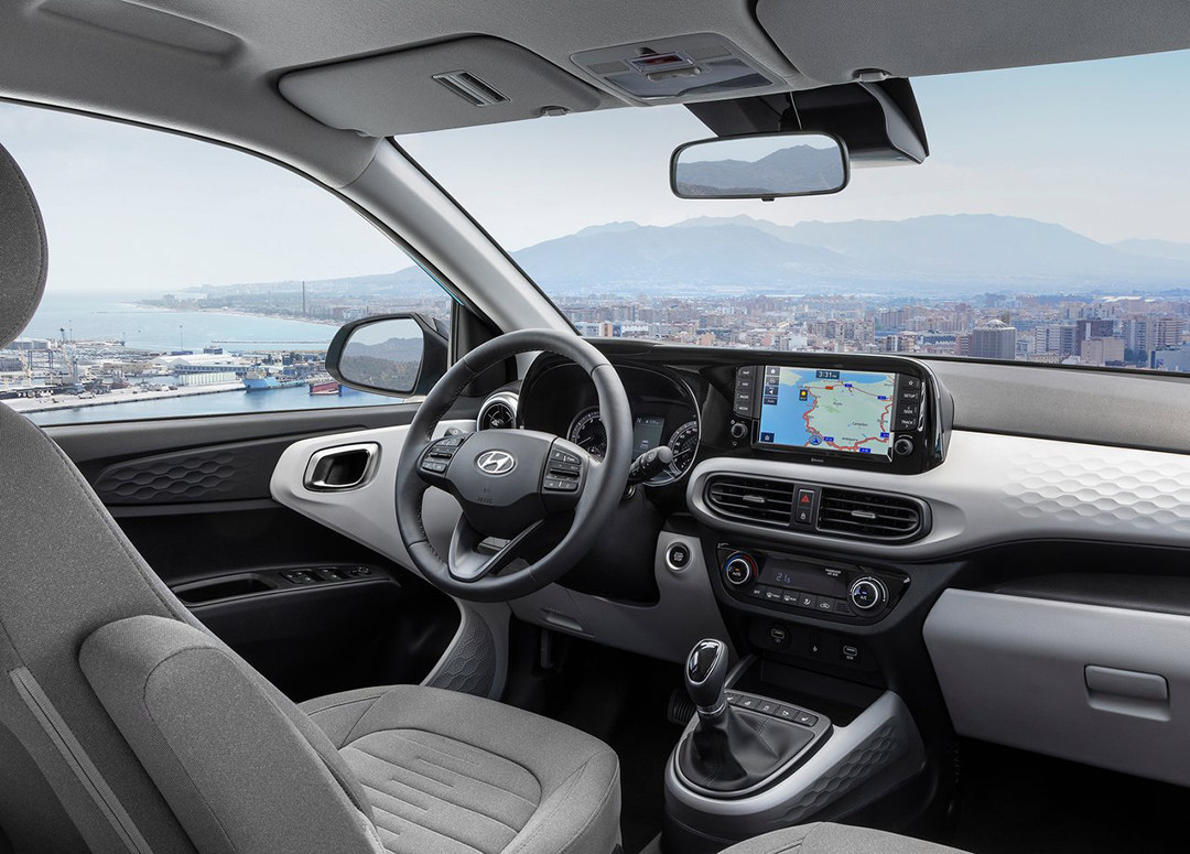 中控屏与仪表板区域采用了一体式设计,但受限于成本,全新i10并没有采用流行的贯穿式中控屏设计,只采用机械仪表以及8英寸触控屏的配置,虽然配置看似不高,但中控屏整合了苹果CarPlay和Android Auto手机互联、远程车辆控制等功能。同时一键启动、自动启停、手机无线充电板、自动空调、前排座椅加热、方向盘加热、驻车雷达、定速巡航等在新车上也有配备。