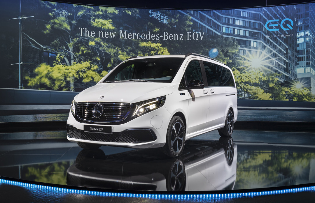 梅赛德斯-奔驰旗下的V级纯电动车型——EQV也在2019法兰克福车展上亮相。EQV是EQ系列第二款量产车型,基本上延续了V级的车身设计,在前脸处更改为EQ系列的前脸,在中网下方留有小面积的热交换散热孔,其余部分封死降低车辆的风阻。同时,充电口设置在左侧大灯下方,方便车辆充电。