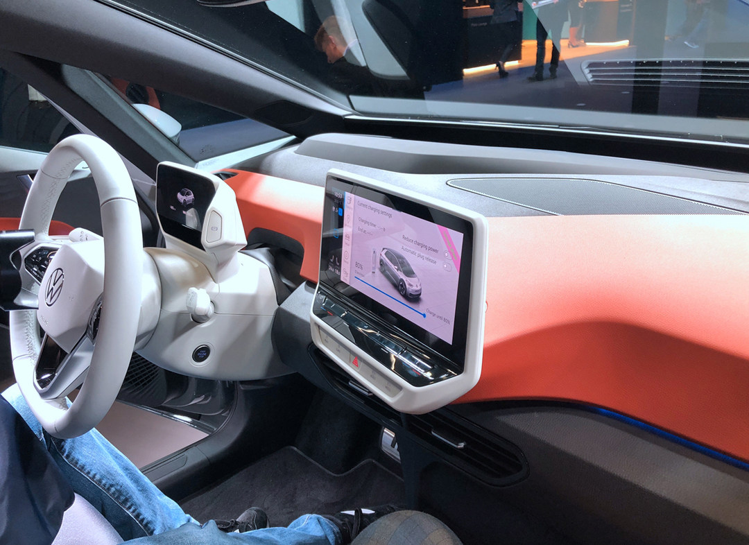 内饰方面,ID.3也是以简洁为主要设计核心,整套内饰除了中央悬浮式液晶屏以及驾驶员前方的显示屏以外,就没有其他显示部件或者触控部件。同时ID.3将电子挡把跟仪表盘做成一体式设计,进一步增强了车厢内部的一体化理念。