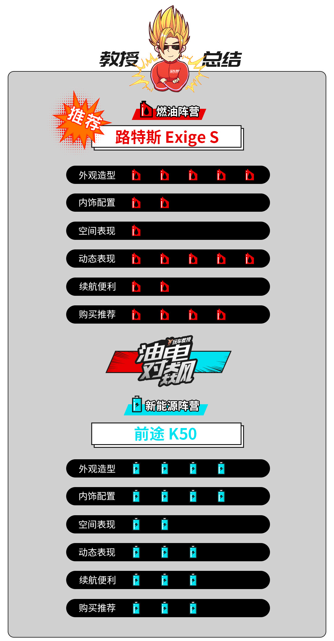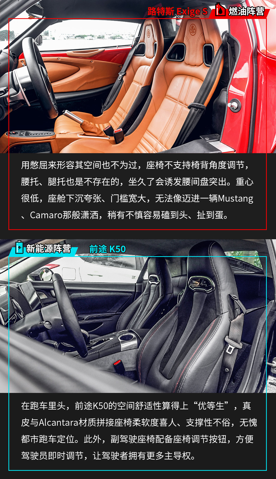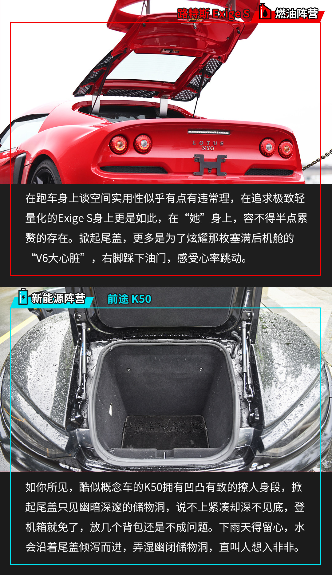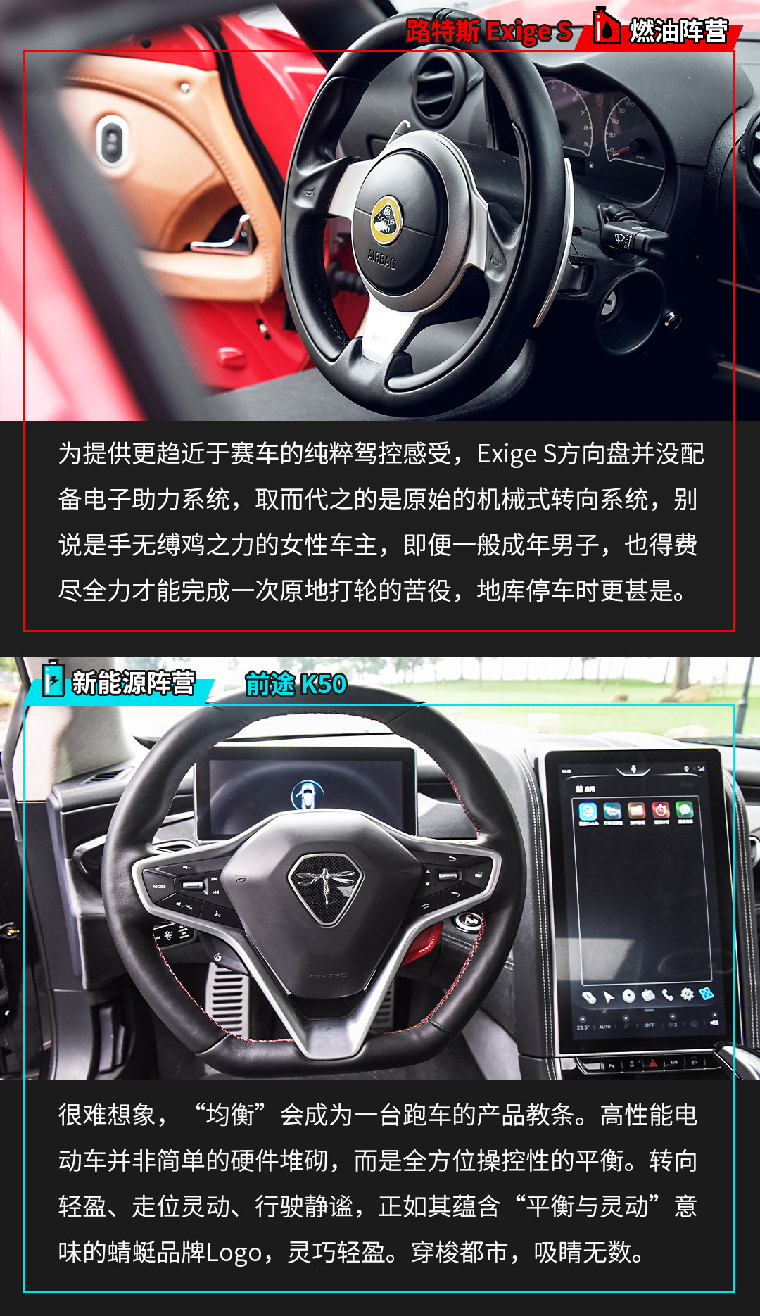 路特斯Exige S油箱体积仅为40L,据统计,车主综合油耗达15L/100km,换而言之,一箱油大概只能满足市区出行300km左右,在NEDC续航里程380km的前途K50面前,相形见绌。