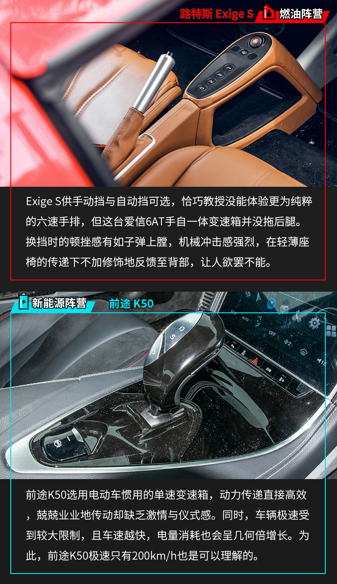 Exige S竟然在燃油车最有把握的续航环节早于“滑铁卢”,要知道前途K50 380km的续航能力在如今动辄五、六百公里的电动车面前仅仅算是合格水准。当然,这也与Exige S追求极致轻量化和车身布局有关,假若换装60L容积油箱,孰胜孰负还真不好说。