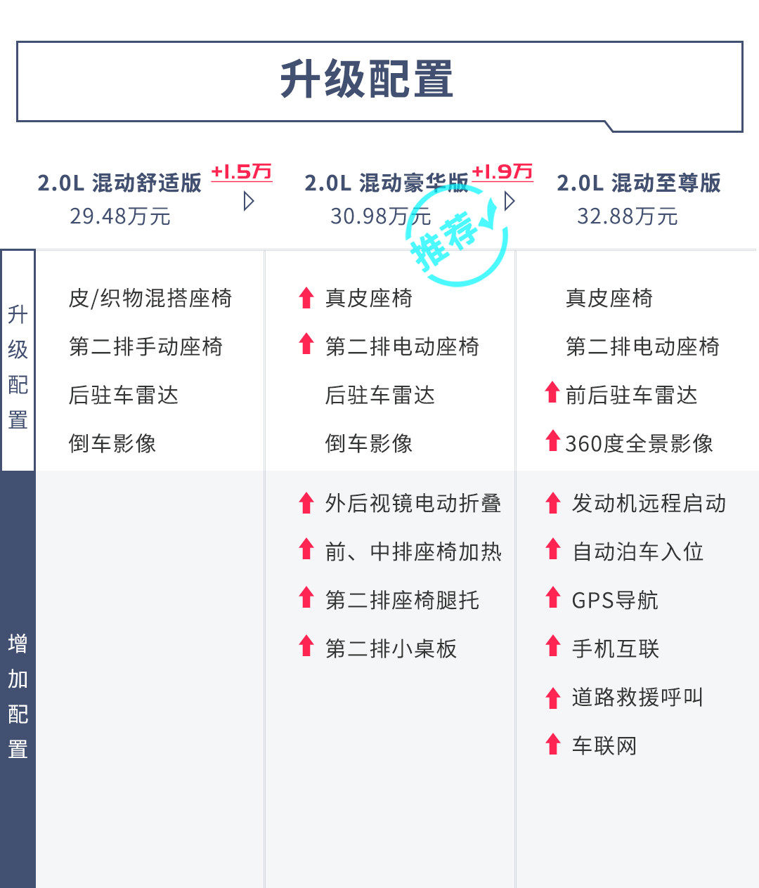 中配豪华版和高配至尊版都拥有了最关键的真皮座椅,第二排座椅也升级为了电动调节。其中豪华版在舒适版的基础上进一步增强了第二排的配置,像座椅加热、腿托、小桌板这几个配置都能大幅提升豪华高级感和乘坐体验,多花这1万5无疑非常值,这也是教授把中配豪华版列为推荐的原因。