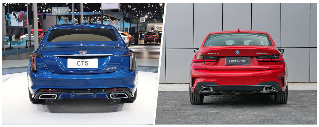 CT5的尾部延续了凯迪拉克家族一贯的高调,直列式尾灯独一无二。尾箱门和牌照框刚好组成外内两个盾形,切合家族风格。宝马3系的尾部则立体感更强,防撞梁的位置更加突出,同时两款车都采用了货真价实的双边双出排气管。