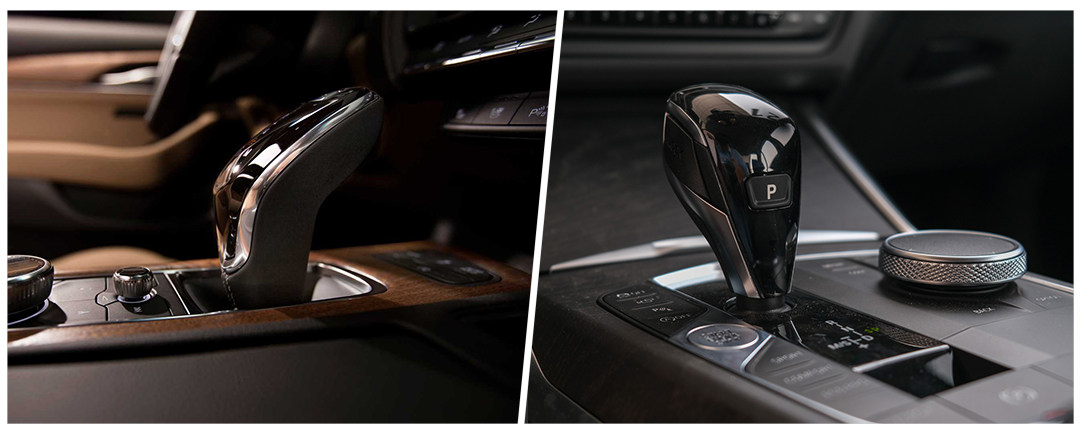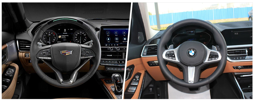 CT5的方向盘中央的设计为盾形,是凯迪拉克的经典设计,仔细看上半圈有一个LED显示条,这表示CT5将会搭载Super Cruise超级巡航系统(准L3级自动驾驶系统,在高配版CT6上有搭载),运动版宝马3系的方向盘则依然是熟悉的“丁字裤”造型,握环尺寸相当粗壮。