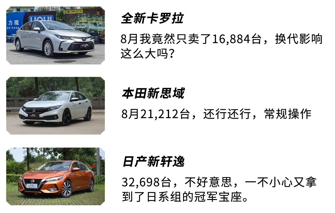 这款车就是近期刚换代上市不久的东风日产第14代轩逸,与之相比,同样刚更新的卡罗拉8月交车量仅为16,884台,与峰值3万+的销量相差甚大,当然可以理解为这是换代的阵痛期。