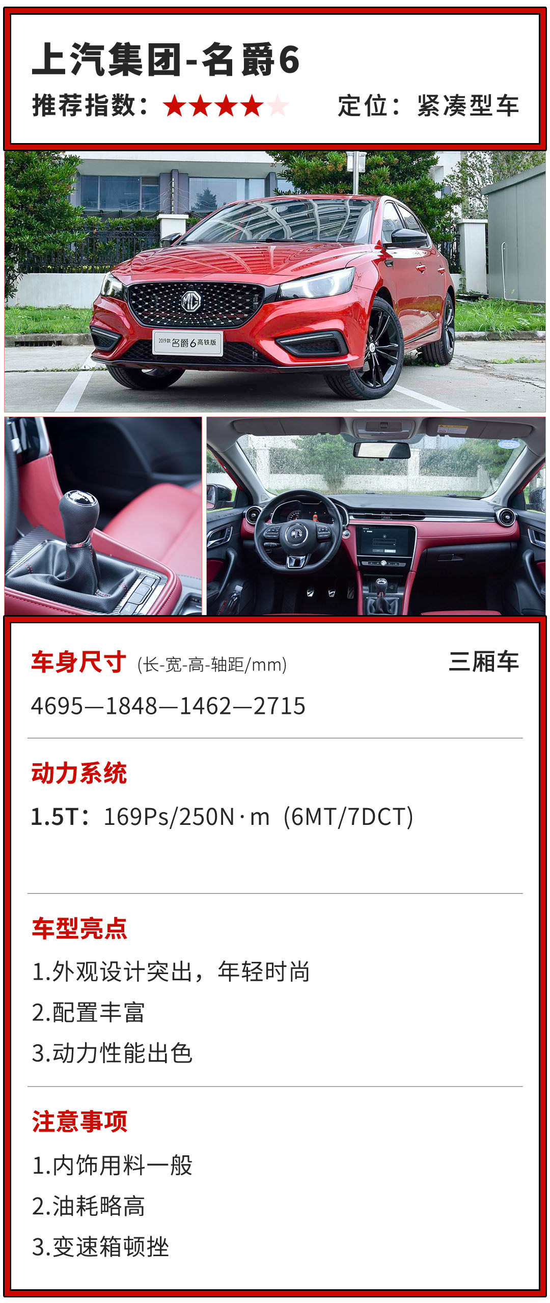 除了外观之外,最大的亮点就是名爵6的动力性能了。名爵6搭载一台1.5T的发动机,最大功率达到了169马力,零百加速仅仅只需要7秒就能完成,是在这个价位几乎没有竞争对手。虽然,外观和动力都不错,但是名爵的内饰工艺以及变速箱的表现并不是很令人满意,内饰用料较为一般,有一定的塑料感,而变速箱经常会出现顿挫,很容易影响驾驶质感。