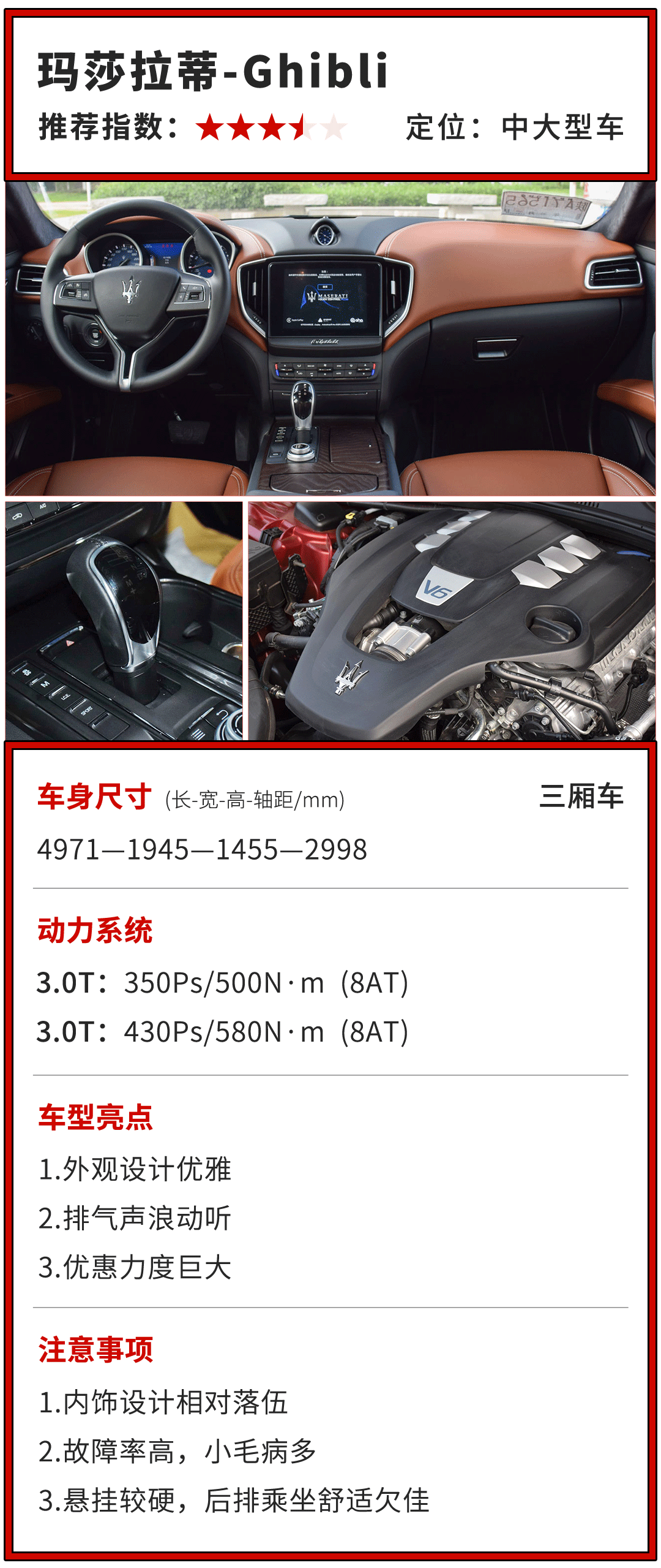 但是,Ghibli也和玛莎拉蒂品牌以及所有意大利汽车一样,可靠耐用性方面一直是老大难,新车的电子元件就已经小毛病不断,随着车龄增长故障率还会越来越高,烧机油、漏冷却液是见怪不怪,老车不是在修车就是在去修车的路上,总之买了Ghibli,新车就抓紧时间拿去爽。