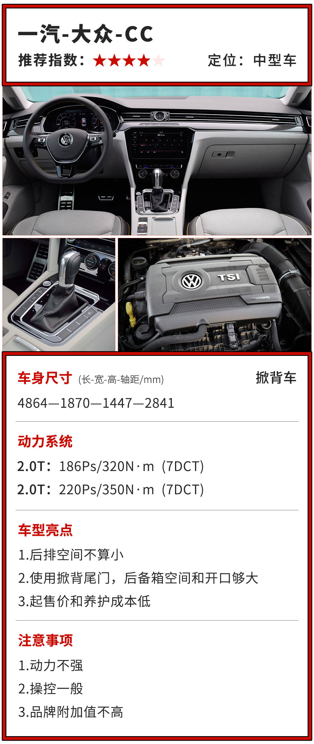 CC应该是目前能用最低成本买到的带有无框式车门的轿跑车型了,这一代CC采用了与同级别兄弟车型帕萨特、迈腾相同的MQB平台以及动力总成,加之是国产车身份,因此售价相对亲民,保养维护价格也与帕萨特、迈腾基本一致,通用零部件非常多。