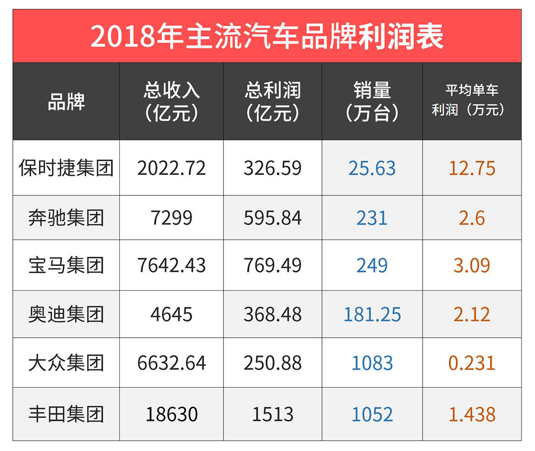 以上统计的是全球范围内的2018年部分汽车品牌的销售数据,从图中我们不难看出,保时捷品牌卖一台车可以有十多万的利润,而BBA相对来说也有两三万。单统计国内数据的话,其实单车利润还会更高一些。