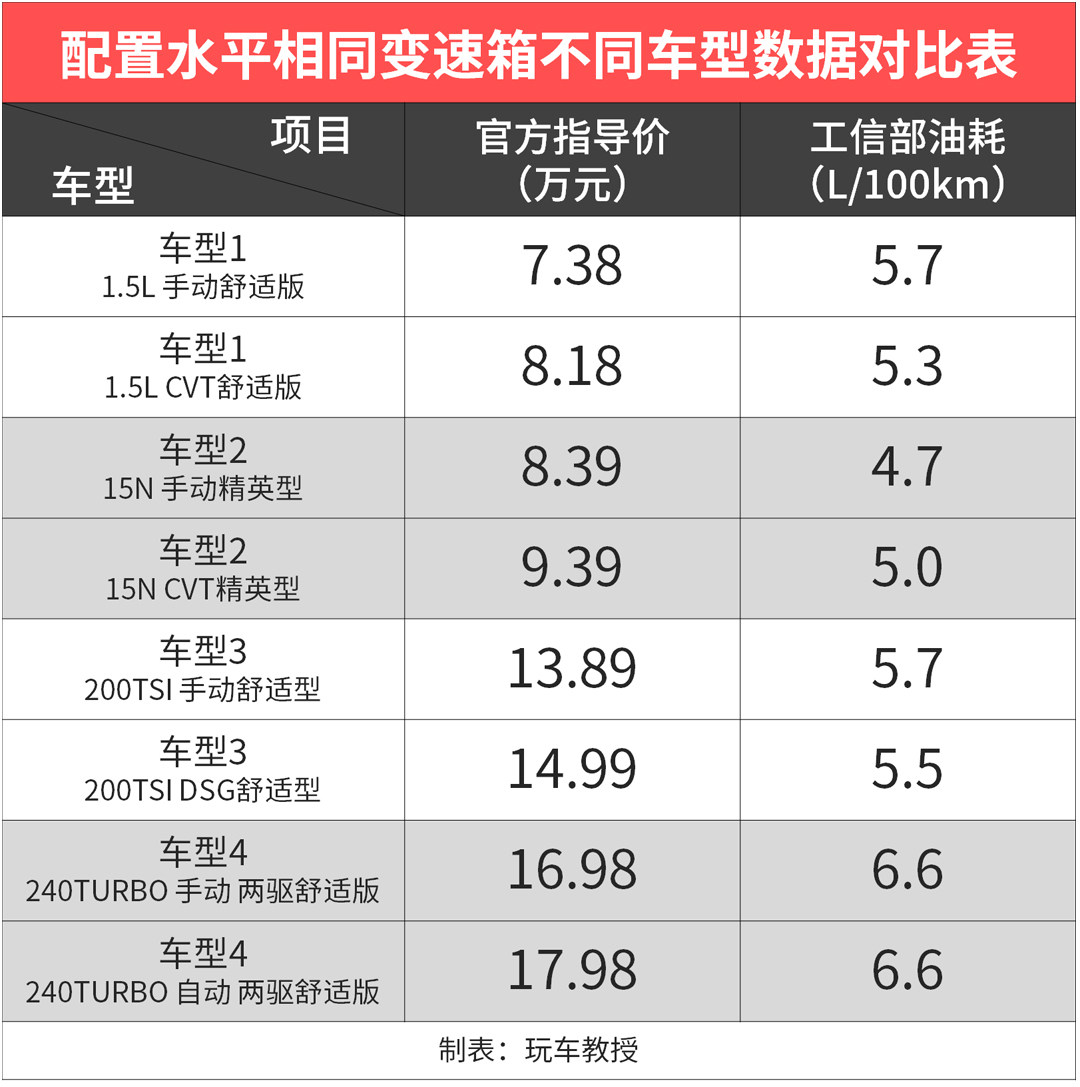 基本上,同一车型配置水平相同的手动挡和自动挡的差价大都在10,000元左右,即便这10,000元换来了一副非常优秀的自动挡,真的能每100公里省下0.4升的燃油(我们取表中的最大差值),那也要开37万公里以上才能把这10,000元的官方指导价差距抹平(92#汽油当前参考价6.76元/升),这还是不考虑二者维护成本差距的情况下。