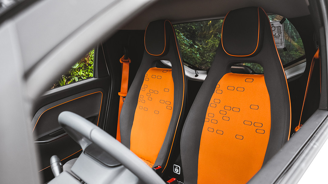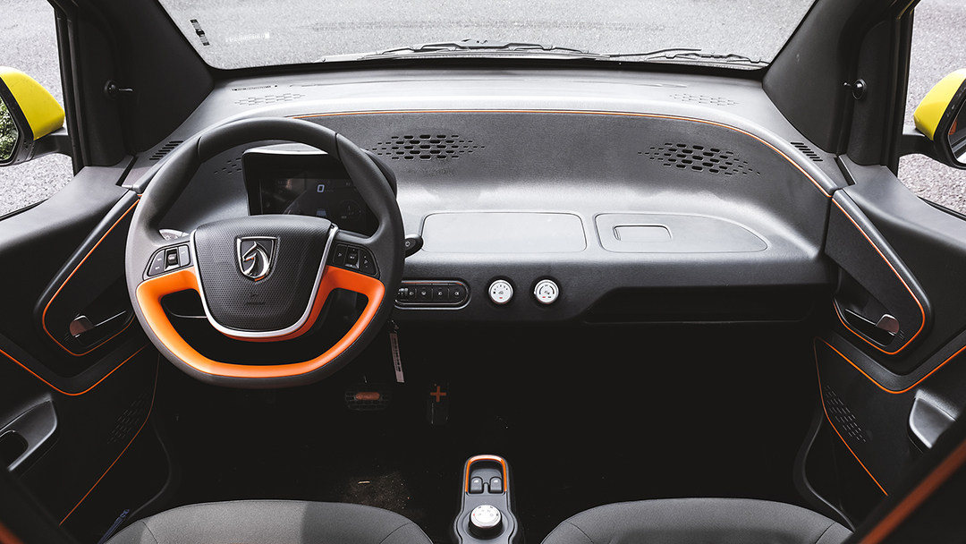 拉开宝骏E100的车门,我们依旧能看到一个非常“概念感”的车厢,这台E100智行版并未在中控台上配备屏幕或平板电脑插槽,空调出风口也是以不可调节方向的小孔形式布置在中控台前端,加上黑色主调与橙色轮廓线的点缀,使得宝骏E100的内饰看起来极具未来感。