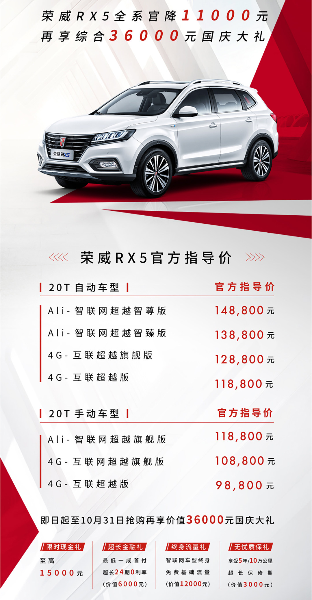 日前,荣威RX5新增车型20T自动Ali智联网超越智臻版正式上市,新车官方指导价为13.88万元。同时官方正式宣布荣威RX5将全系官降11000元。此外,在10月31日之前购买该车的消费者即可享受最高1.5万元限时现金礼价值6000元的最低1成首付/24期0利率超长金融礼;价值12000元的智联网车型终身免费基础流量终身流量礼;以及价值3000元的5年/10万公里超长保修期无优质保礼。新增车型主要针对配置进行调整,提供内置互联网汽车智能系统3.0的10.4英寸中控屏、前排座椅加热、ATC双区自动空调以及智能防夹电动尾门等舒适性配置。新增车型细化了车系的配置水平,以满足不同消费者的需求,加上新车售价的优惠,吸引力可谓不少。