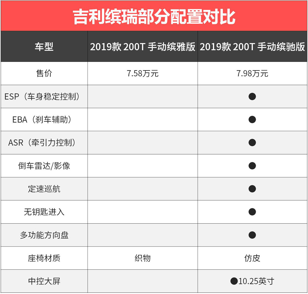 手动缤雅版缤瑞的售价只要7.58万元起,相较于次低配——7.98万元的手动缤驰版,价格只相差了区区4000。对于这一级别的目标消费者而言,4000元的差价并不是个小数目,但如果看完配置表的话,你才知道这4000块该不该花。