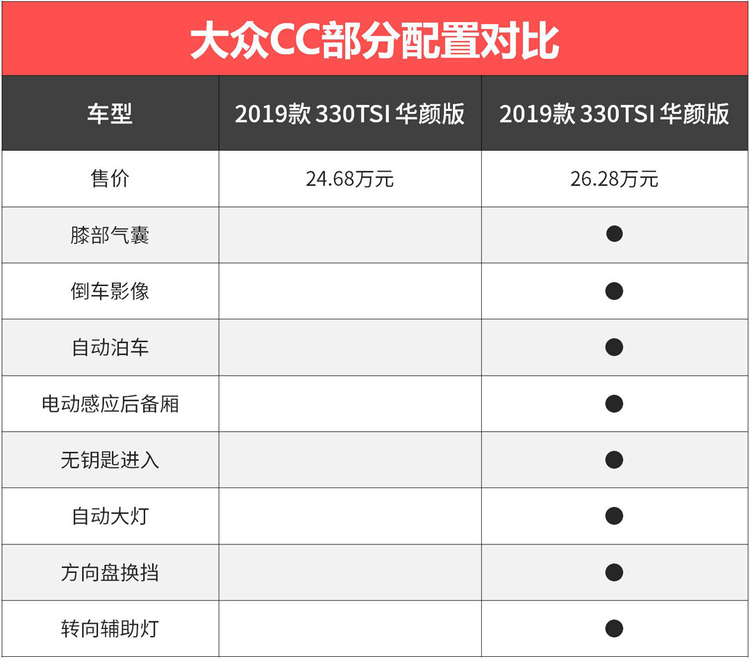 大众CC最低配的的华颜版相比中配的魅颜版,价格相差了1.6万,但在配置上却是天壤之别。华颜版较魅颜版缺失了膝部气囊、倒车影像、自动泊车、电动感应后备厢、全车无钥匙进入等功能。