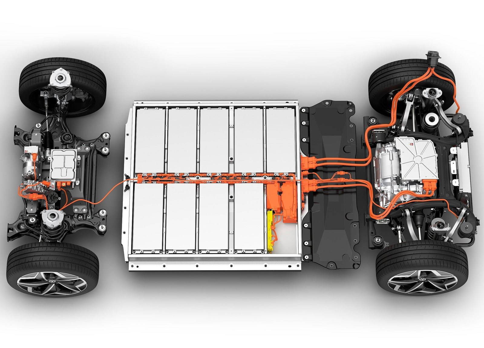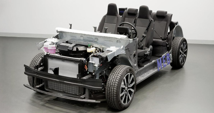 在MEB平台中,动力电池放置于该平台的板面上,位于前、后桥之间,可实现载荷的均匀分布。该电池可驱动前桥或后桥,亦或是同时驱动前后桥,具体情况视车辆设计及类型而定。该平台可配置不同容量的电池,使电动车的最大续航里程数达到550公里(约合341英里)。