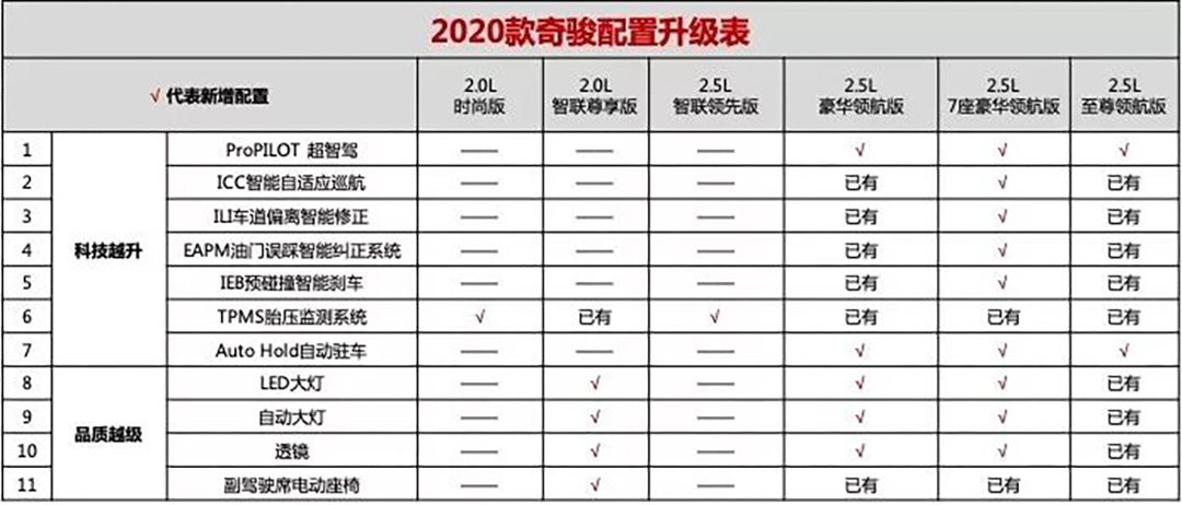 日前,2020款日产奇骏正式上市,新车提供8款车型可选,售价为18.88-27.33万元。作为年度车型,新车外观内饰并未有太多改动,而针对配置作出了小幅修改,如部分车型新增ProPILOT 超智驾、AUTO HOLD自动驻车等。而新车动力上依旧搭载2.0L和2.5L两款自然吸气发动机,值得注意的是2020款奇骏只有2.5L车型会配备四驱系统,2.0L车型仅提供前驱车型。