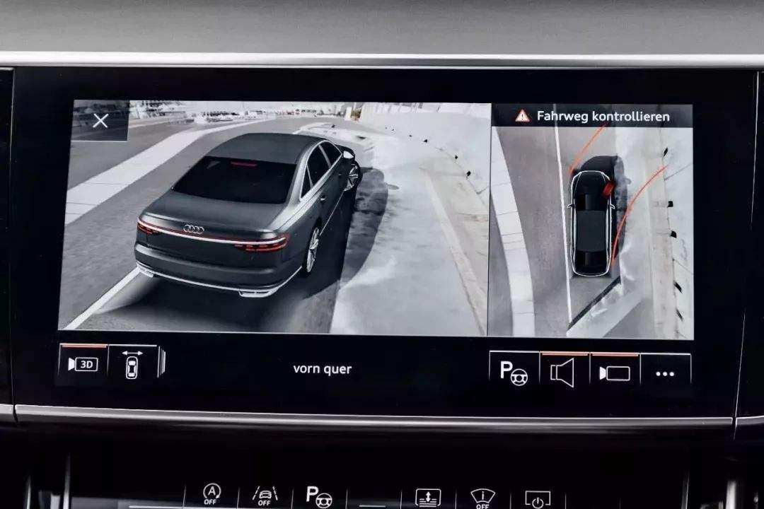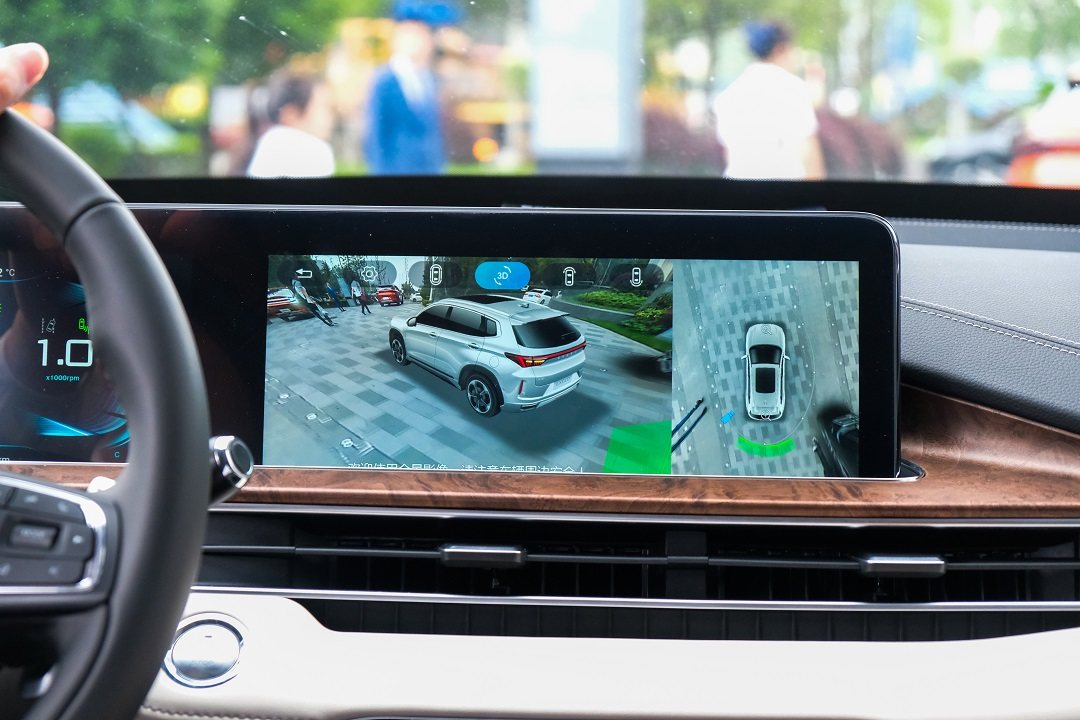 还有就是倒车影像3D视角,这个功能常见于自主品牌的新车,3D视角下可以模拟出当时车辆所处场景的各个视角,你可以来回拖动查看任意的角度,而现在大部分车型都只有俯视图投影,而这个功能现在在十来万的家用车上是越来越多,BBA貌似也是这一代的奥迪才开始使用。