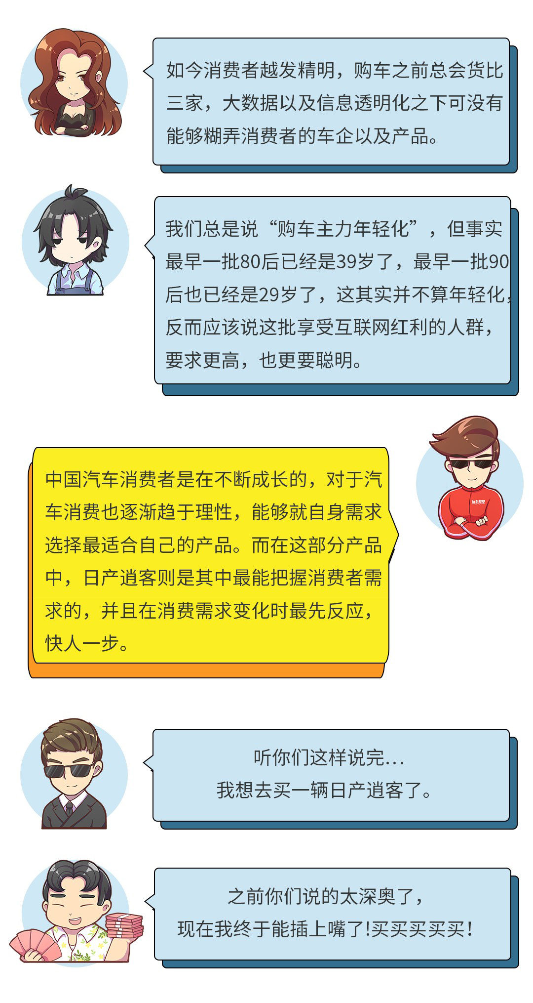 所以,中国消费者在消费观方面越发成熟,也更能分辨车型是否适合自身需求,而他们需求也不断在升级,更追求良好的用车体验,逍客正是能满足于此。