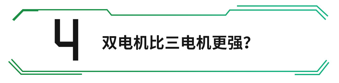 全驱版使用三电机,系统总功率222kW,总扭矩665N·m,由于三电机的存在,所以耗电量随之增加,所以全驱版车型只有370km的续航里程。根据实测,后驱版车型0-100km/h加速时间为7.9秒,100-0km/h制动距离为40.2m。