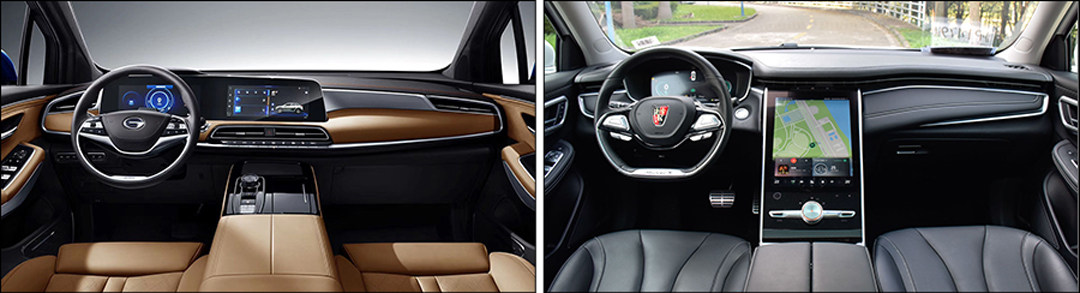 两者的内饰都是以豪华为主要设计目标,Aion LX的内饰以大面积的曲面屏为设计重心,贯穿左右的皮革以及全车大面积的皮革包裹是其亮点,根据车型的不同可以提供高级皮质以及豪华真皮材质给客户选择,甚至还能选装Nappa真皮。两款12.3英寸的屏幕通过一块玻璃冷弯工艺融合在一起,如果是使用一体式曲面屏,相信效果更佳,噱头更足,但对成本控制和制造工艺是一大考验。
