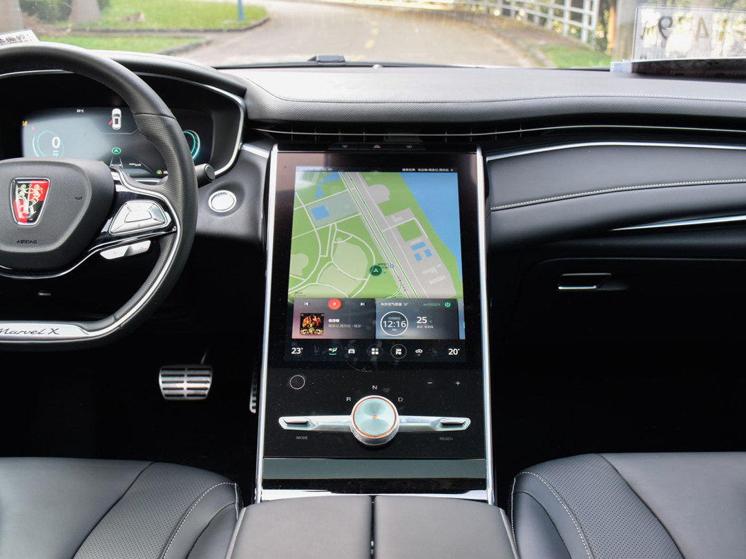 MARVEL X的内饰使用翼展式元素,将空调出风口和翼展元素融合,将一体化进行到底;同时超大屏幕是MARVEL X的亮点,斜置的设计有助于驾驶员以及车内乘员的读取信息和操作,大屏集成了车辆几乎所有功能,就连调节空调出风口的风向都需要在大屏内调节,是不是有点特斯拉的味道?