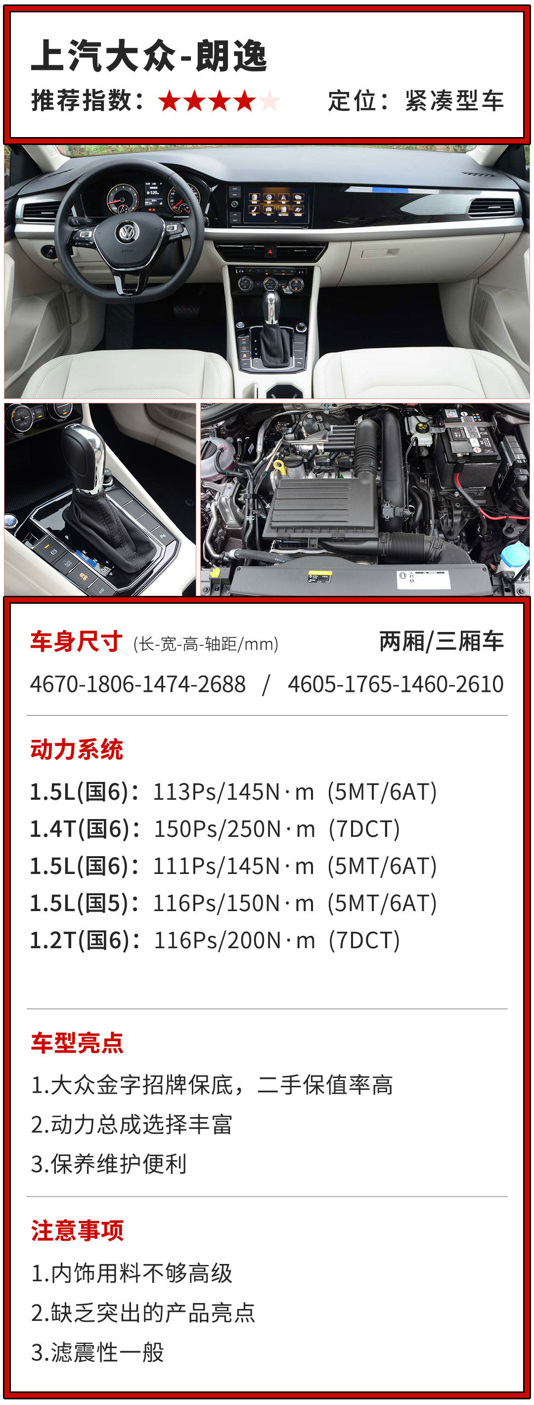 目前在售的朗逸分为了三厢/两厢、新款/经典款、1.5L/1.4T/1.2T、手动/自动/双离合多种不同搭配的款式。首先,最符合多数国人审美的无疑是三厢版,而两厢版在国内这个价位的车中属于小众,论实用性也不如三厢版,因此先排除掉两厢版是毫无悬念的;其次,1.4T+7速双离合的版本虽然动力更强,但对于这个价位的紧凑型家用车来说,省油、耐用、平顺才是排在首位的需求,因此1.4T的款式也不是最优选。