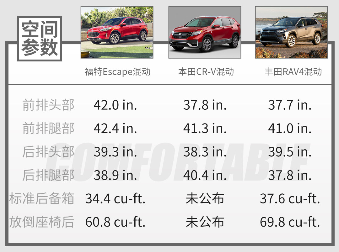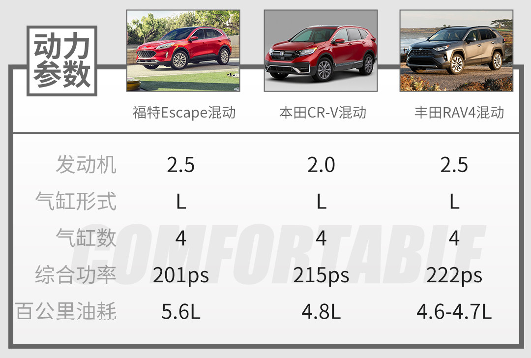 其实最终还有个价格对比,因为性价比也是消费者很关注的一点。但由于是美国市场的价格对比,和我们国内消费者关系不大,国内新款RAV4、新款CR-V、福特Escape都还没上市,我们也就要留到后面再进行一番比较了。从上面的几个部分对比来看,这三款混动SUV都各有胜负的地方,综合实力的差距不大,最终喜欢哪个,还是要看消费者自己比较看重车的哪一点。