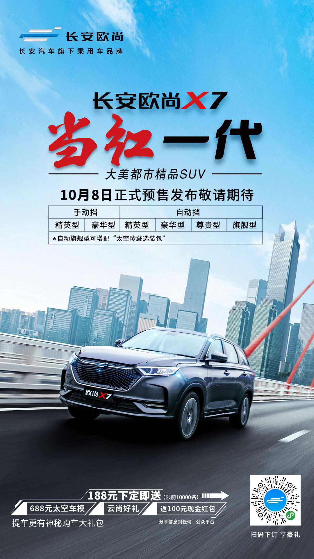 从最新获得的消息,搭载着多项核心技术、领先科技的长安欧尚X7推出六款全新车型,分别是:手动精英型、手动豪华型、自动精英型、自动豪华型、自动尊贵型、自动旗舰型;同时,长安欧尚X7将会在2019年10月8日正式开启预售并公布预售价格。即日起参与意向预定长安欧尚X7,只需支付188元即可获得太空珍藏版车模、线上抽奖、100元现金红包等福利大奖!