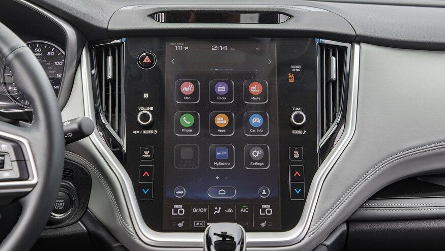 对比起上一代,新款傲虎的性能表现没有太大差别,但是内饰的变化却是很难忽略的。全新的11.6英寸触摸屏竖立在中控中间,很震撼,只是有点像沃尔沃的设计。这款中控触摸屏看起来很高档,一用起来就发现了一些缺点,底部固定空调开关控制是不错,但是有些图标太小了以致于经常误操作。这款屏幕支持Apple Carplay,可由于是竖直放置的,Carplay只能显示在中间一块区域。除了这些,新款斯巴鲁傲虎保留了实体的音量控制和FM控制旋钮,这点值得点赞。