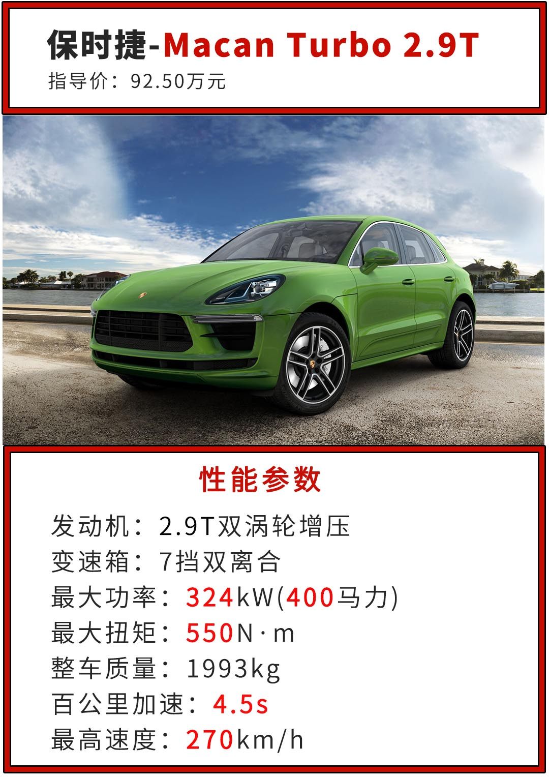 新款的保时捷Macan Turbo搭载了2.9T双涡轮增压V6发动机,虽然在排量上没有老款的那台3.6T唬人,但参数上却和后者旗鼓相当,同样为400马力的最大功率和550N·m的最大扭矩。与发动机匹配的是7速PDK双离合变速箱,0-100km/h加速时间为4.5秒,比老款的3.6T车型快了0.3秒。