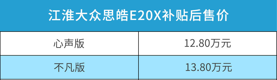 作为江淮汽车和大众汽车合资后的首款车型,思皓E20X到来意义重大。它标志着江淮大众的电气化项目落地,同时,也能够推动大众在中国新能源战略的实施。比较遗憾的是,新车各方面表现都不尽人意,卖点并不突出,12.8万元起步的售价偏贵,在强者林立的新能源汽车市场里,思皓E20X能否为江淮大众打响“开门红”成为疑问。