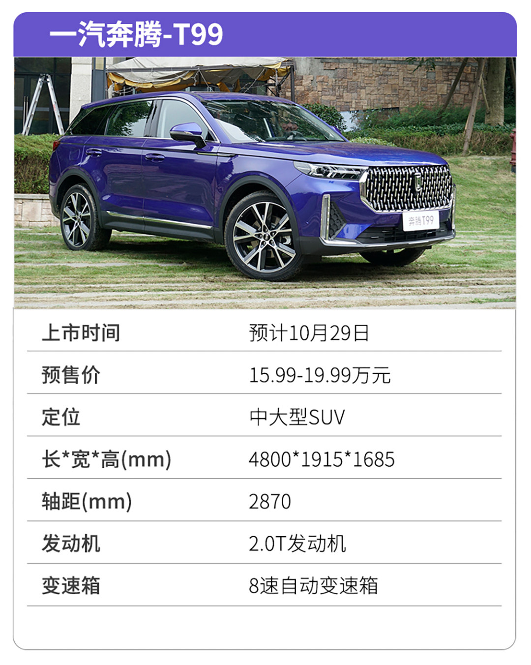 奔腾T99是继T77、T33后T系列又一款全新SUV车型,新车定位中大型SUV,同时也是家族的旗舰车型。