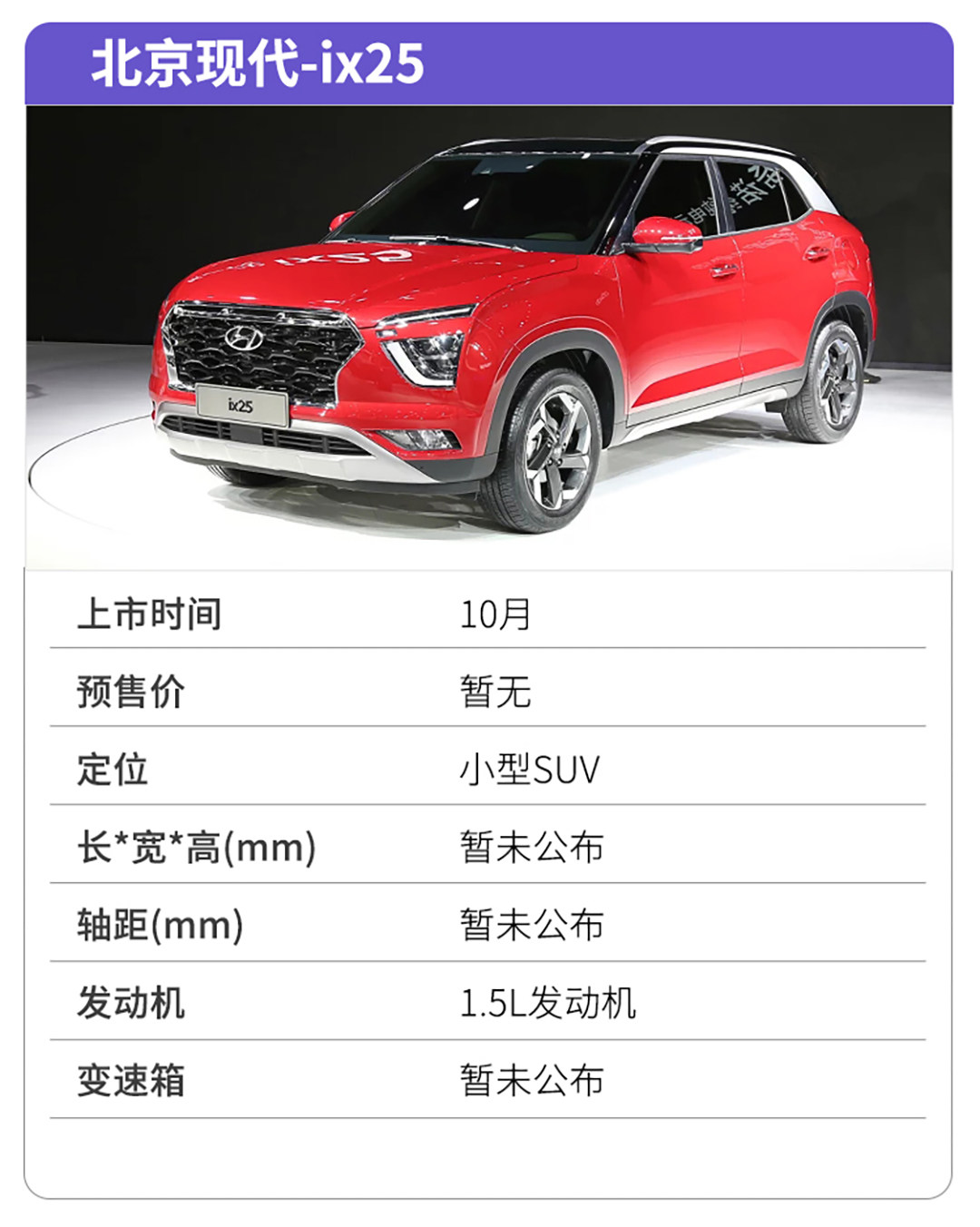 正值现代的品牌的更新热潮,品牌旗下各车系纷纷换上全新的设计语言,这次轮到了旗下小型SUV——ix25。自2014年问世的ix25终于迎来的换代,新车已于2019正式发布,相关消息显示新车将于10月上市。