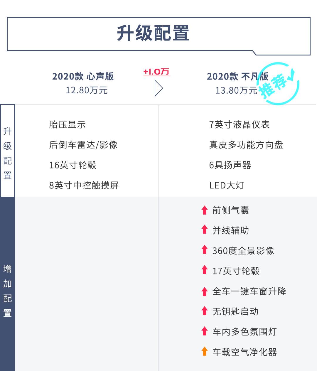 增加1万元后,不凡版在配置上有着较高的优势,很多实用性的配置都会得到加成,如果注重配置所带来的用车便利性,那么直接上顶配选择不凡版即可。