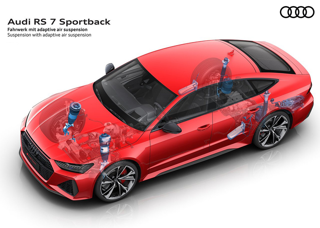此外,RS7 Sportback标配自适应空气悬架,使得它离地间距比普通A7 Sportback降低了20mm,在120km/h的时速上能够再下降10mm,另外配有“升降模式”能将车身高度提高20mm,方便应对复杂路况。