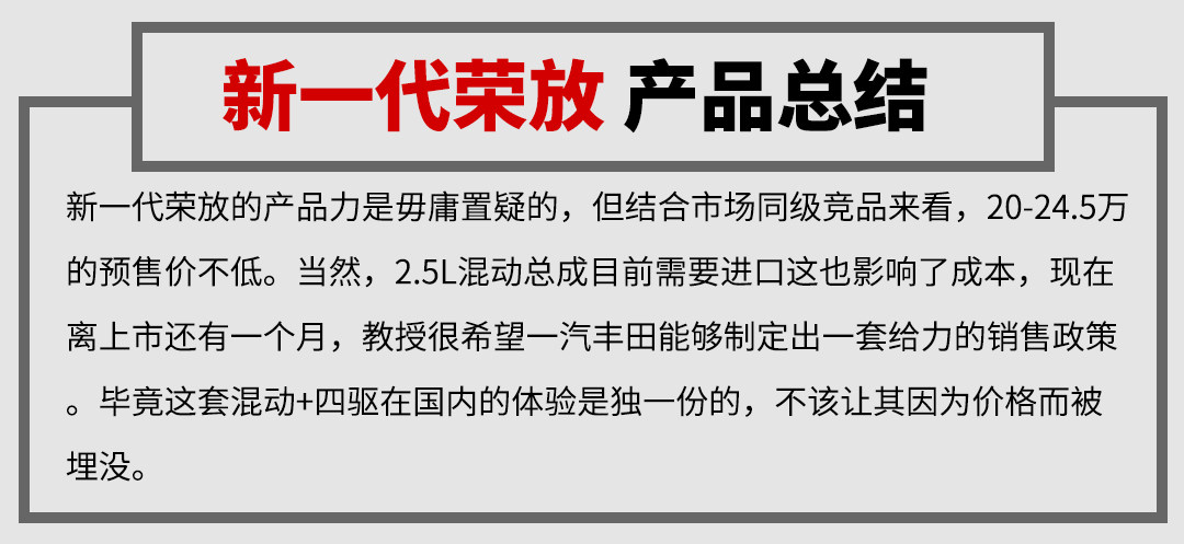 教授个人觉得主要关注前面两点就好,或者说“混动四驱”多出来的那价钱是否撑得起全新的体验。(现售2.5L四驱指导价为23.88万,新一代预售24.5万)虽然说新的2.0L动力已经在凯美瑞,亚洲龙上证明了自己,但个人还是认为2.5L混动才是证明这次“丰田大法”好不好的关键,同时新一代荣放上的油电混动也是个开始,丰田已经计划在全系SUV中普及混动。