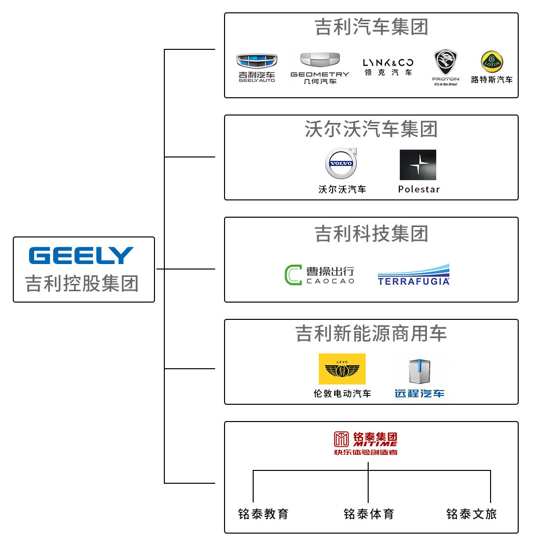2018年2月24日,吉利控股集团以90亿美元收购德国汽车巨头戴姆勒集团(奔驰母公司)9.69%股份,一举成为戴姆勒集团的最大股东。截止至今年10月,浙江吉利控股集团旗下拥有吉利汽车集团(吉利汽车、几何汽车、领克、宝腾汽车、路特斯汽车)、沃尔沃汽车集团(沃尔沃汽车、Polestar)、吉利科技集团(太力飞行汽车、曹操出行)、吉利新能源商用车(轮滚电动车公司、远程商用车)、铭泰集团共五大子集团。