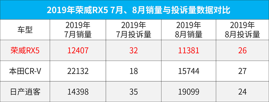 根据数据显示,荣威RX5在过去两个月的投诉排行榜中以58例位居第15位。8月销量11381辆,投诉量仅为26例,销量投诉比重为0.0022,同比7月份下降了17.2%,与素以皮实耐用的日系车本田CR-V、日产逍客等车型相比,也不落下风。